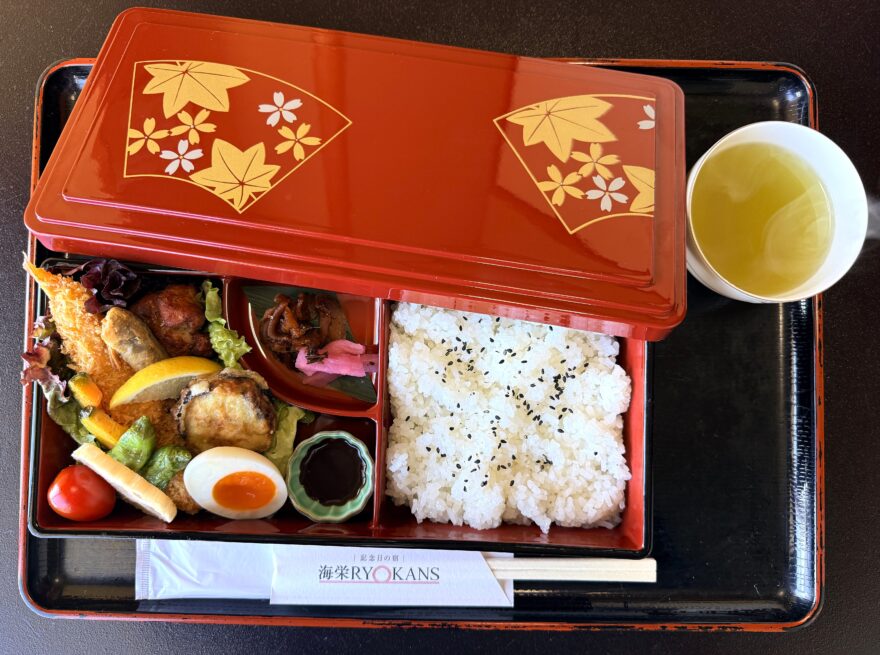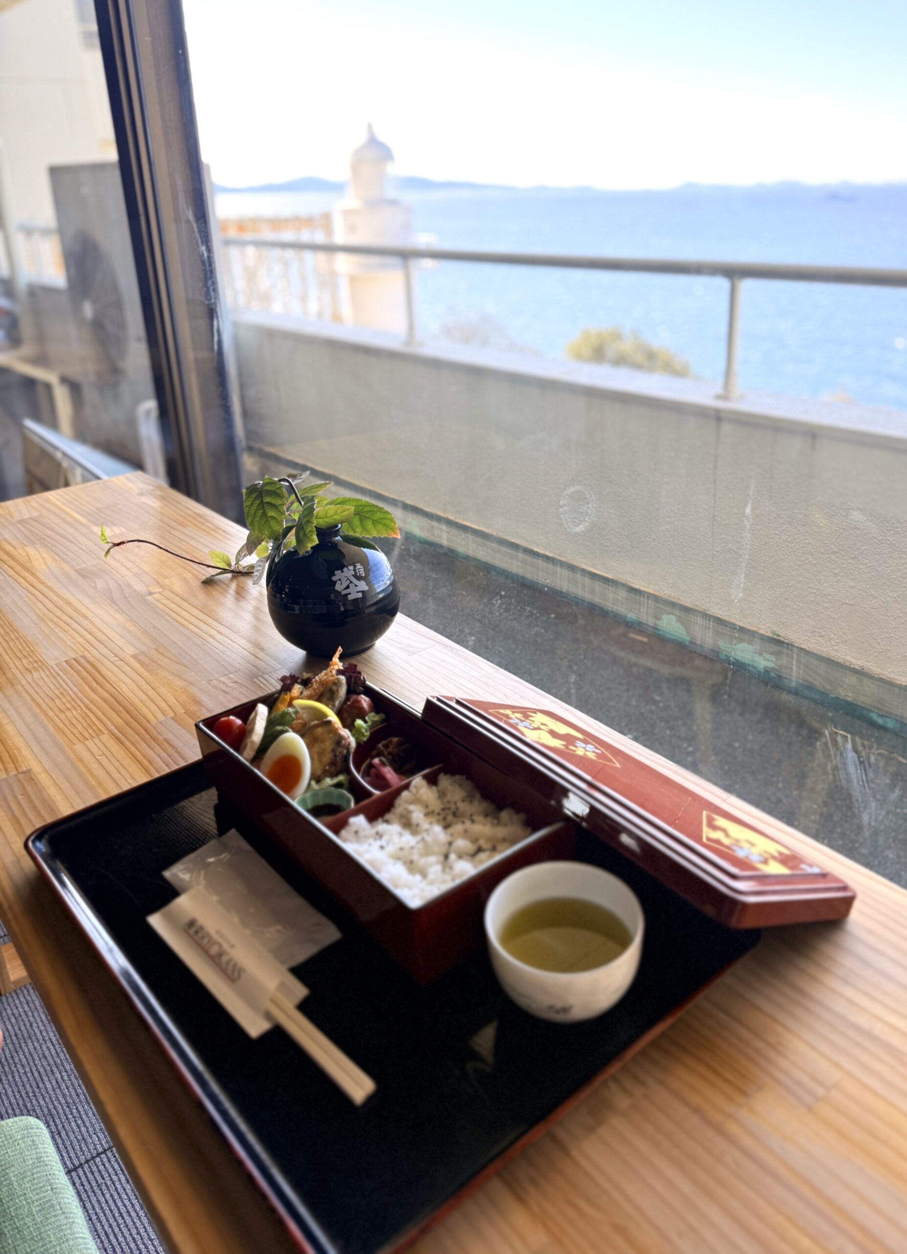 三河湾の大パノラマを見渡しながらゆっくりと食事が楽しめる人気のテラスです。このたつき灯台テラスに新メニューが登場しました!「家康弁当」1000円です。