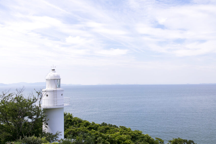 愛知県蒲郡市にある橋田鼻灯台は、西浦半島の先端、橋田鼻に立つ白亜円形の灯台です。周辺は、三河湾国定公園に指定され、三河湾を望む風光明媚な地として知られています。